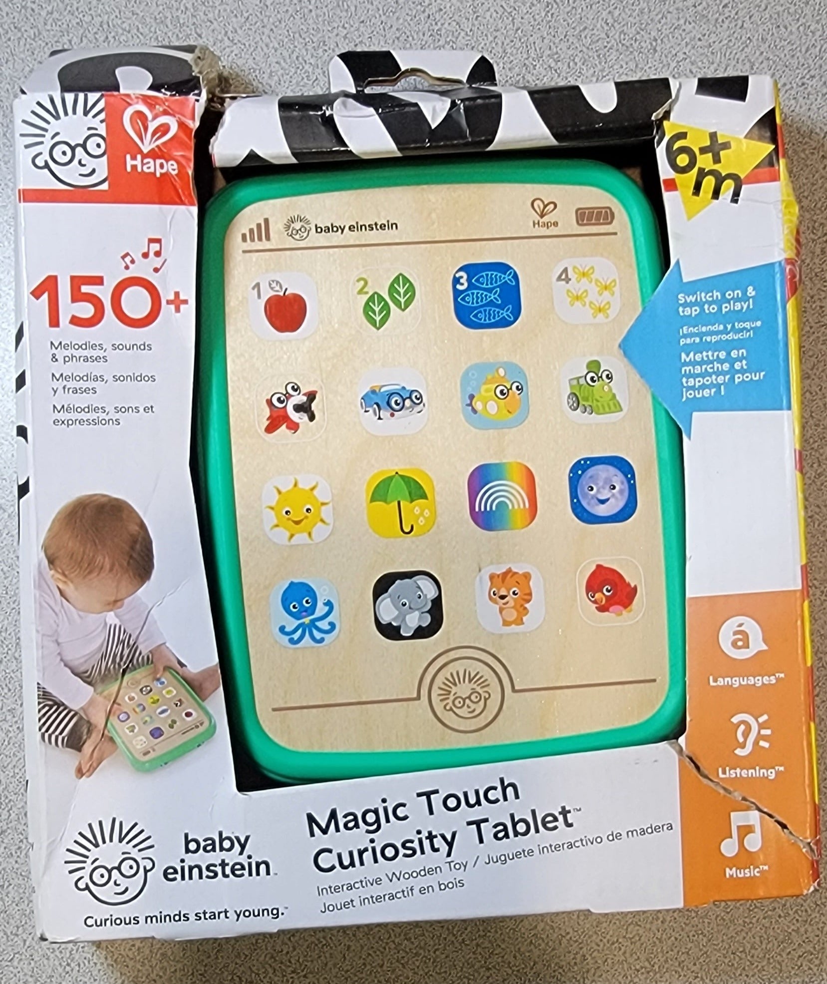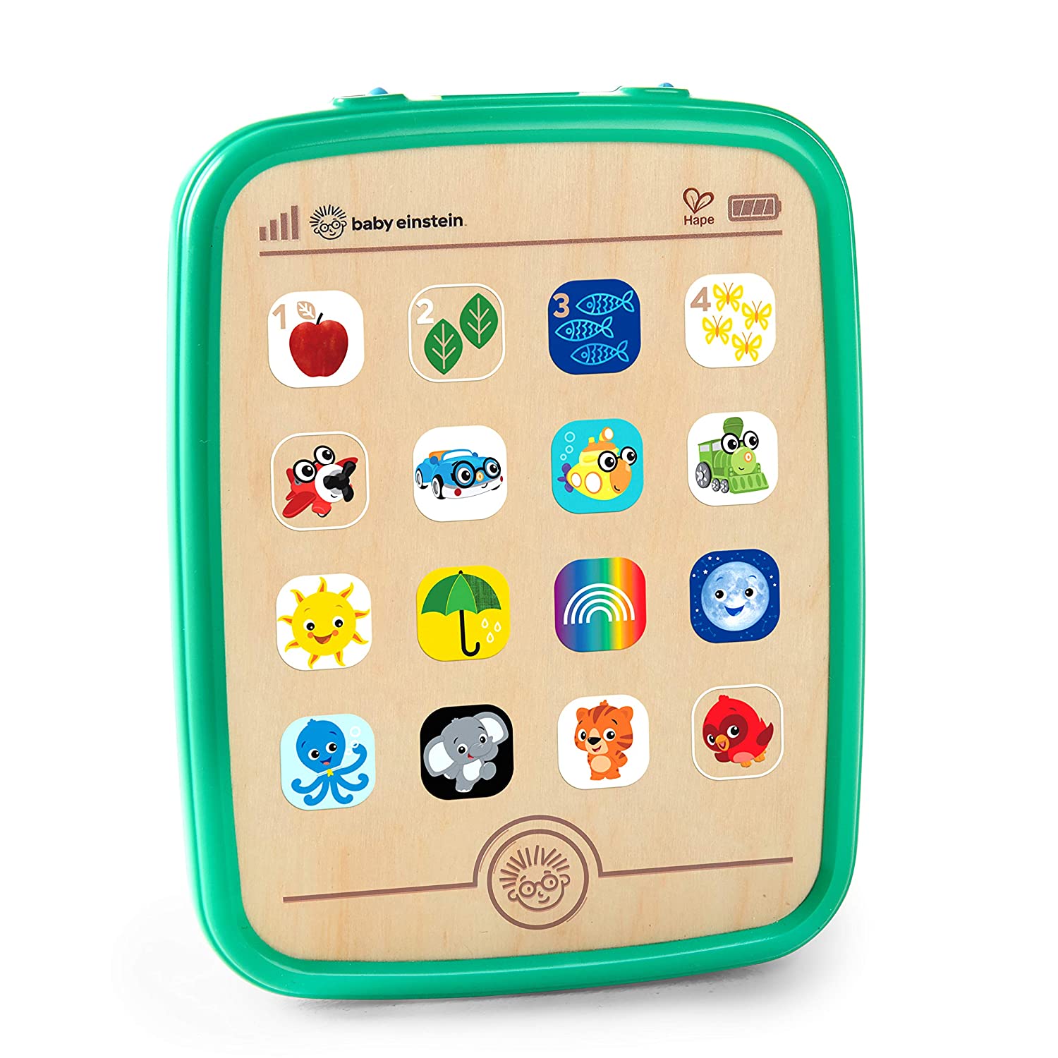 With the Magic Touch Curiosity Tablet your little one can launch into a world of discovery from her very first device. Just a tap of an "app" on this magical wooden toy starts the fun. From colors and numbers to first words in three different languages, this tablet toy is a tool that encourages development of fine motor skills with every press of a tile. Baby Einstein buddies will introduce your little one to 48+ melodies and sounds to help stimulate his senses. The durable design of this wooden toy means you won't have to worry about cracked screens or protection plans. Baby will love to discover something new with every touch of this unique musical toy.
